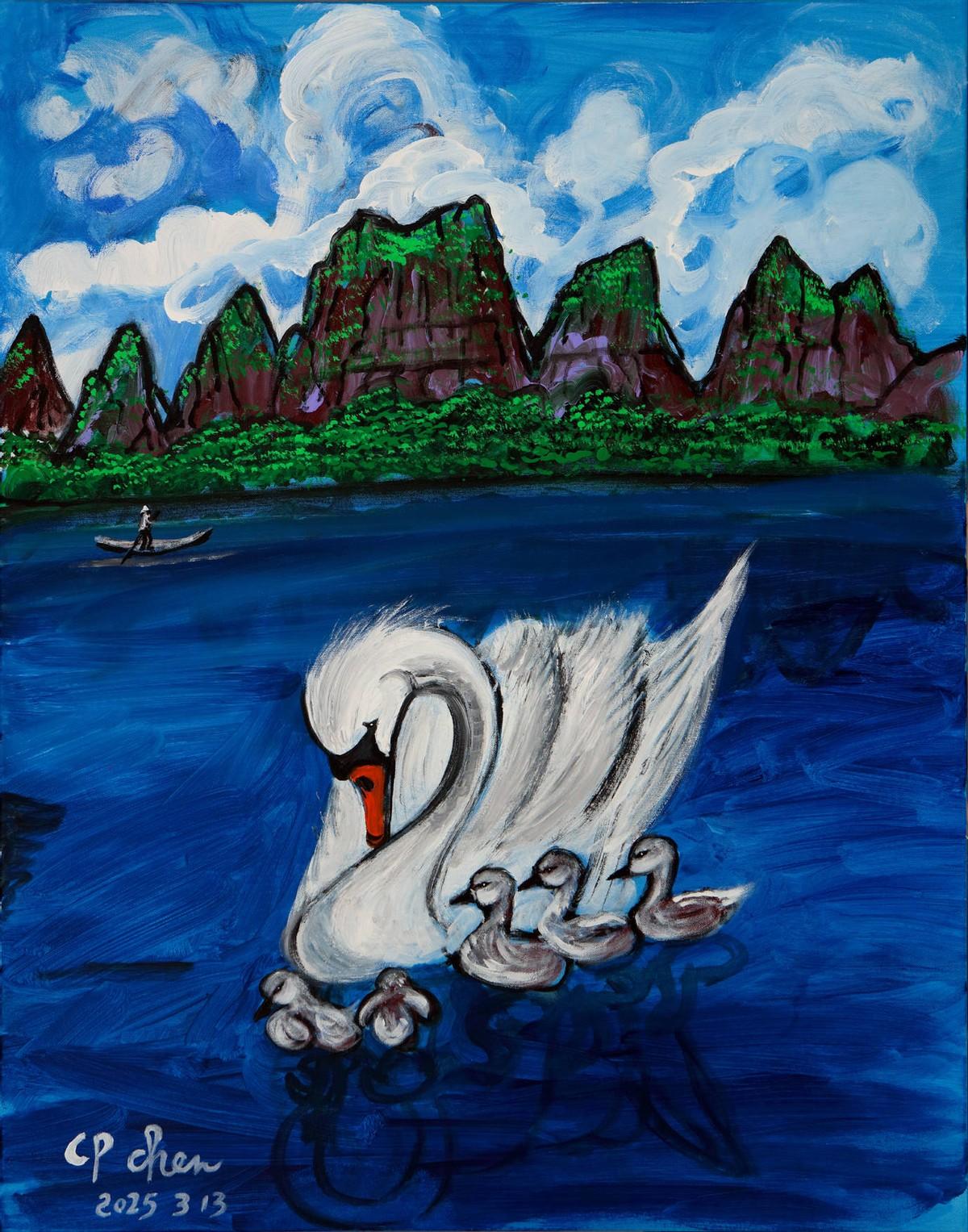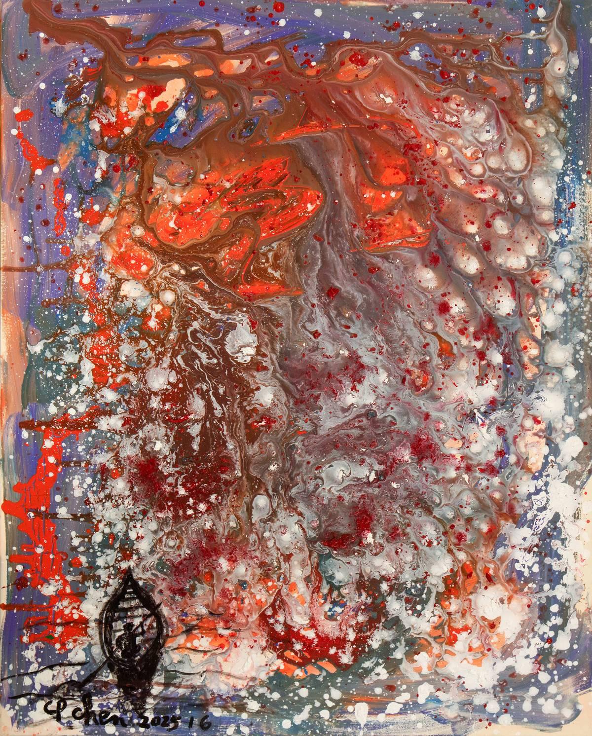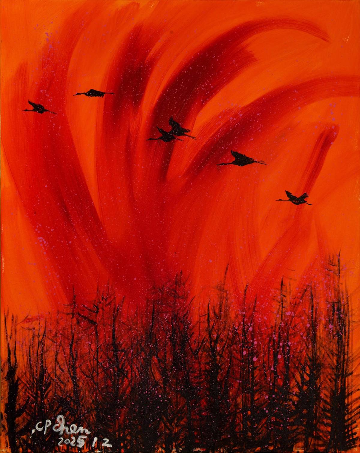 重拾画笔、潜心创作,是陈持平对文化传承的自觉坚守,也是对人生使命的接续践行。秉承父辈嘱托与文化初心,他坚定走上中西艺术融合、传统与现代对话的创作道路,将深厚学养融入笔墨色彩之中。以西方绘画的色彩表现力为基,融合中国书法篆书的沉厚、草书的灵动,形成放而不纵、狂而有度的艺术风格;作品《半壕春水一城花》《晴空一鹤排云上》等,于色块交错间勾勒生机气象,于笔墨流转中传递精神力量,实现了理性思维与感性表达的和谐统一,展现出严谨治学与自由创作相得益彰的人生境界。