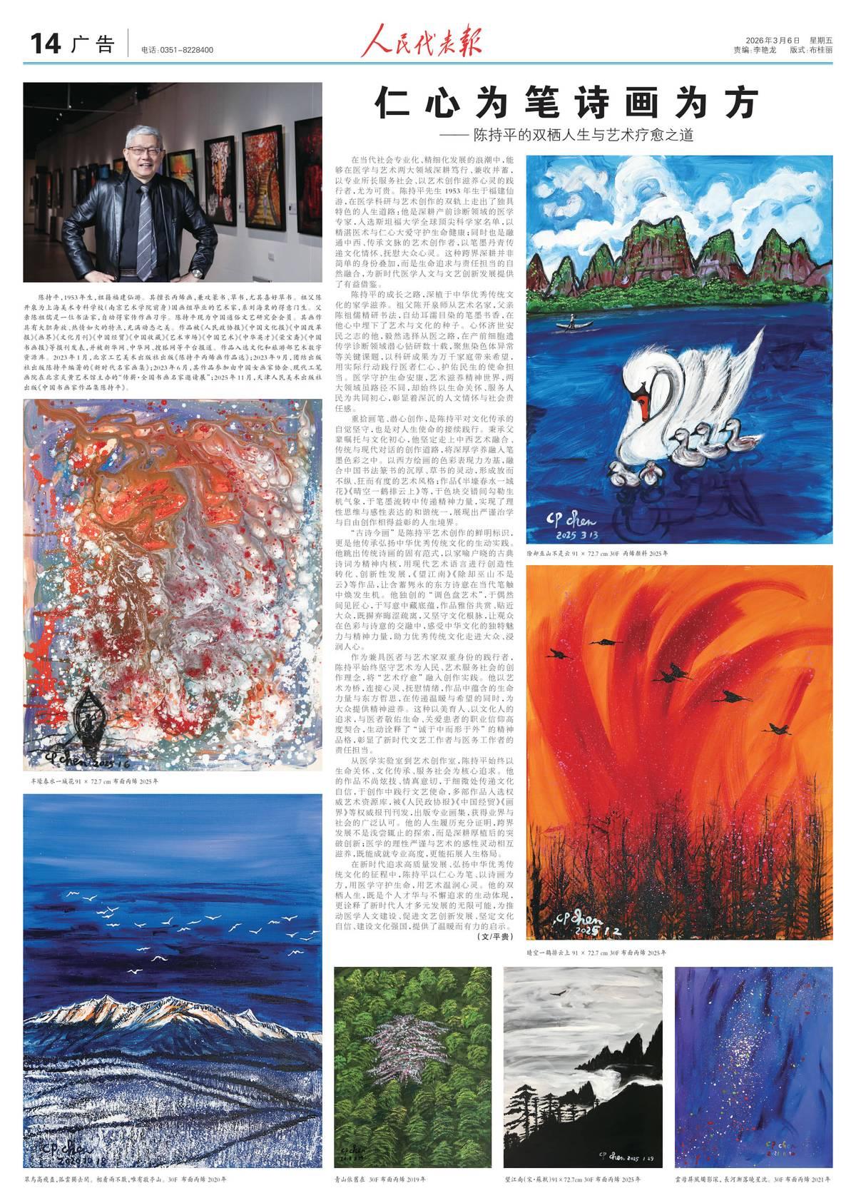《人民代表报》第14版,专题报道《仁心为笔 诗画为方——陈持平的双栖人生与艺术疗愈之道》。