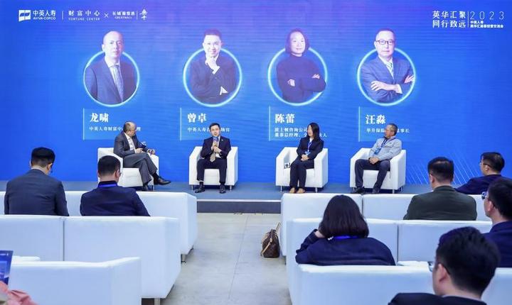 在圆桌论坛环节,中英人寿首席市场官曾卓、波士顿咨询公司董事总经理、全球合伙人陈蕾、华升保险代理董事长汪淼、中英人寿财富中心总经理龙啸共同探讨中国保险高客市场经营趋势。